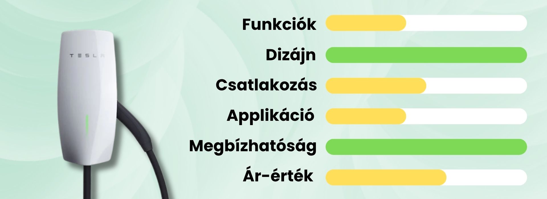 A Tesla hivatalos fali töltője. Gyönyörű kialakítás, átgondolt tervezés, minőségi összeszerelés. Funkciókban ha nem Tesla-val használjuk akkor egy BESEN Basic-nél nem kapunk többet, csak szebbet. Minden ami beállítható az az autó applikációjában érhető el, így kimondottan Teslásoknak ajánlanám, és akkor ha nincs szükség hálózatfigyelésre.