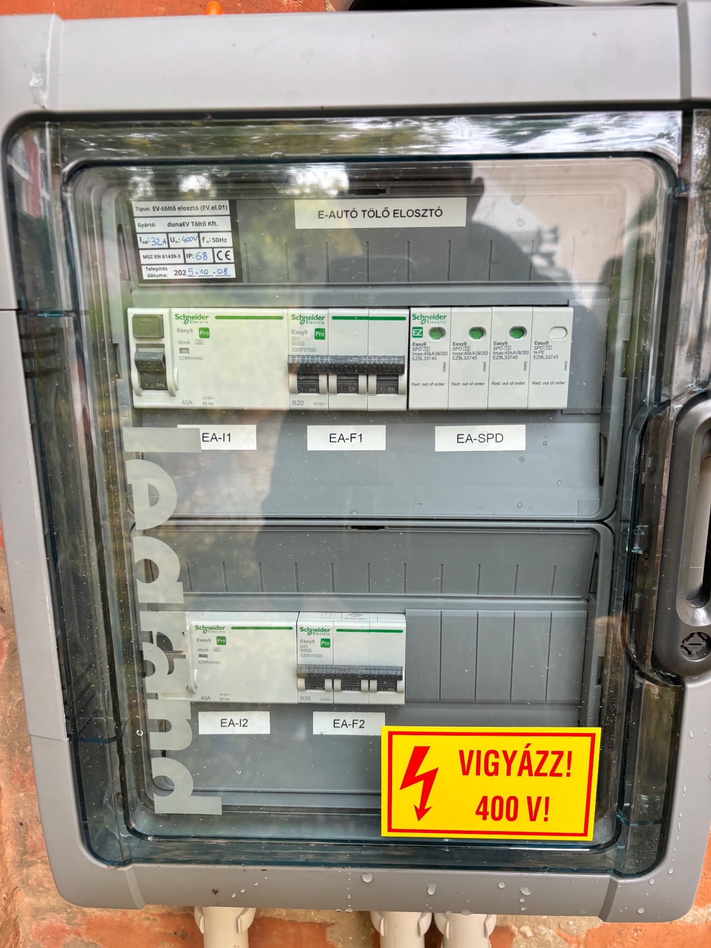 Szabványi előírás a töltő áramkörét külön, más fogyasztóktól független "A"-típusú 30mA hibaáram védő kapcsolóval (Fi-relével) védeni.